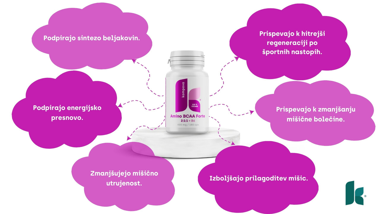 BCAA aminokisline predstavljajo do 35 % vsebnosti mišične mase in so ključne za proizvodnjo energije v športno obremenjenih mišicah. Veljajo za osnovne gradnike beljakovin in sodelujejo pri nastajanju novega mišičnega tkiva.Njihova prisotnost v telesu pospešuje nastajanje beljakovin in preprečuje njihovo razgradnjo v mišicah med težjo vadbo in fizičnim naporom.Amino BCAA Forte so ustvarjene iz posebnih razvejanih esencialnih BCAA aminokislin - l-levcina, l-izolevcina in valina v edinstvenem razmerju 2:1:1. Razmerje 2:1:1 pomeni, da je l-levcina prisoten v največji količini (najučinkovitejši za podporo mišične sinteze in okrevanja). Telo teh pomembnih spojin ne more proizvesti samo, zato je nujno, da jih dobite s hrano ali s prehranskimi dopolnili.