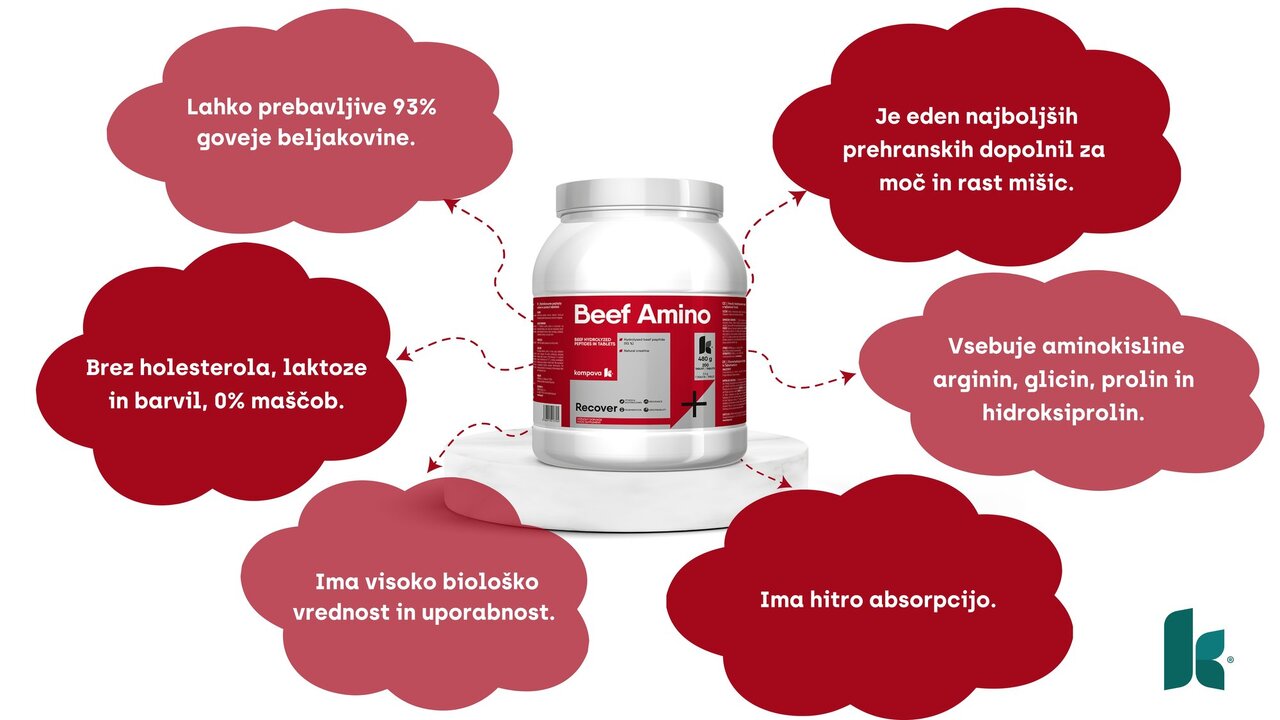 Goveji peptidi so odličen vir esencialnih in neesencialnih aminokislin. Beef Amino vsebuje v optimalnem razmerju aminokisline arginin, glicin, prolin in hidroksiprolin. Te aminokisline zagotavljajo tvorbo kolagena, ki je nujen za zdravje kit, vezi, vezivnih tkiv, srčne mišice in vseh notranjih organov. Hkrati vsebujejo naravni kreatin, železo, cink, fosfor, vitamine skupine B in vitamine E in A.