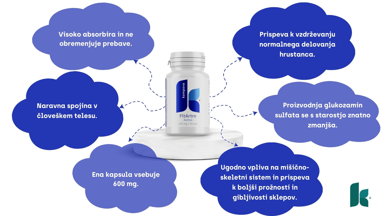 Glukozamin sulfat je naravno prisotna spojina v človeškem telesu in je glavna sestavina hrustanca. Njegova naloga je spodbujati delovanje hrustančnih celic (hondrocitov) k tvorbi gradbenih sestavin hrustanca (glikozaminoglikani in proteoglikani). Na ta način lahko prispeva k ohranjanju normalne funkcije hrustanca. Gre za najpomembnejšo snov, s katero lahko začnete pri zaščiti sklepov in veziv. Glukozamin sulfat je visoko absorpcijski in ne obremenjuje prebave, ugodno vpliva na gibalni sistem in prispeva k boljši prožnosti in gibljivosti sklepov. Tvorba glukozamin sulfata s starostjo izrazito upada.