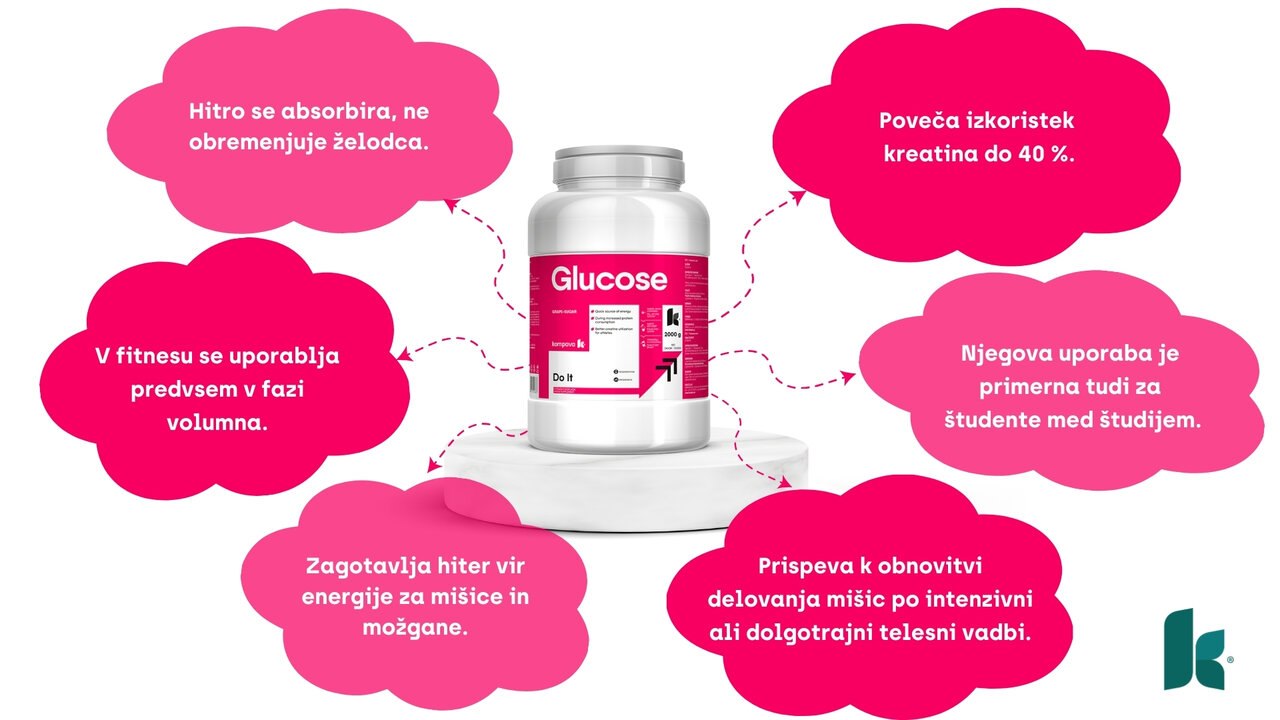Drugače imenovana tudi kot grozdni sladkor, dekstroza ali škrobni sladkor je monosaharid, ki se takoj absorbira v kri brez obremenitve prebavnega sistema.