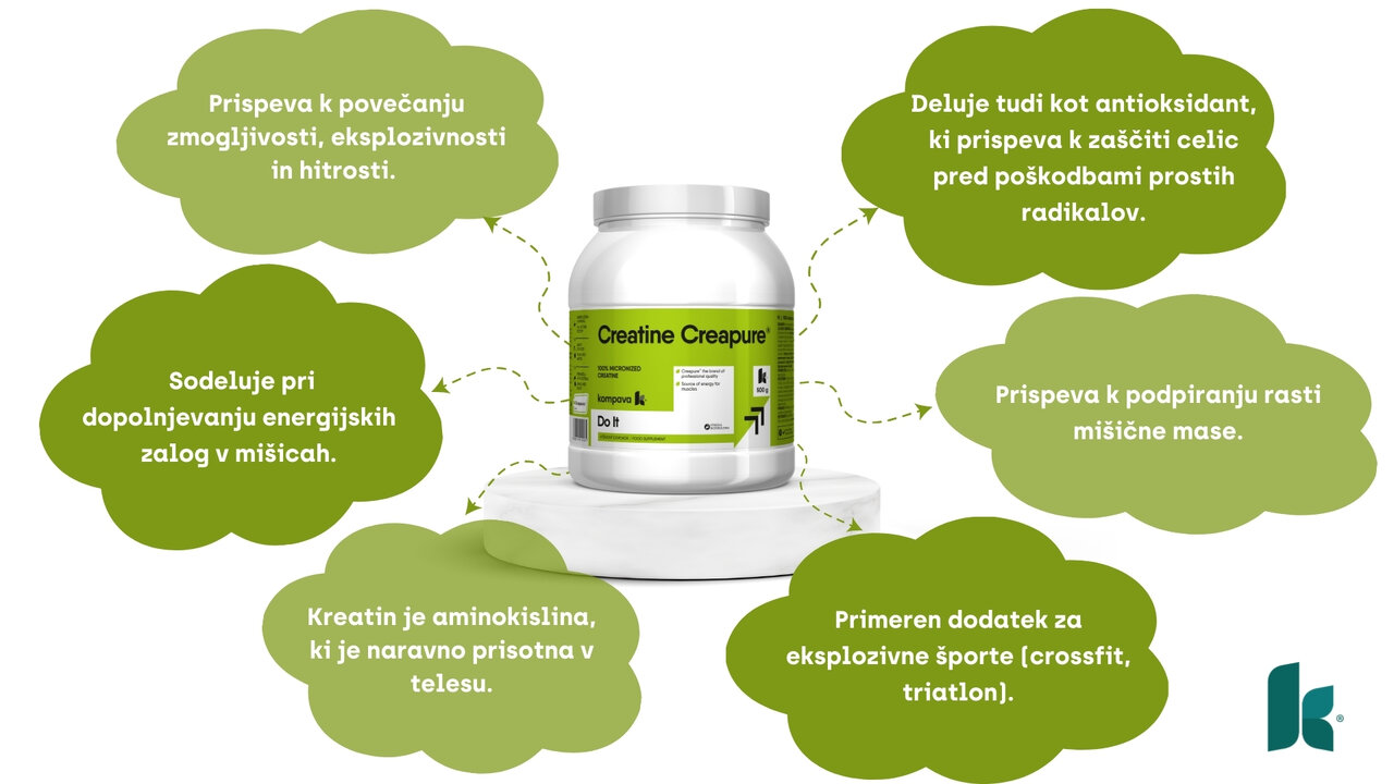Kreatin je aminokislina naravno prisotna v telesu, ki se uporablja za energetsko oskrbo mišic, možganov, srca, pa tudi samih celic. Prispeva k podpori rasti mišične mase, povečanju moči, dinamike in fizične zmogljivosti. Povečuje fizično zmogljivost pri ponavljajočih se visoko intenzivnih vajah s kratkimi intervali počitka. Dnevni vnos kreatina (3 g) lahko poveča učinek odpornega treninga in mišično moč pri ljudeh starejših od 55 let. Kreatin hkrati deluje tudi kot antioksidant, ki prispeva k zaščiti celic pred poškodbami prostih radikalov.