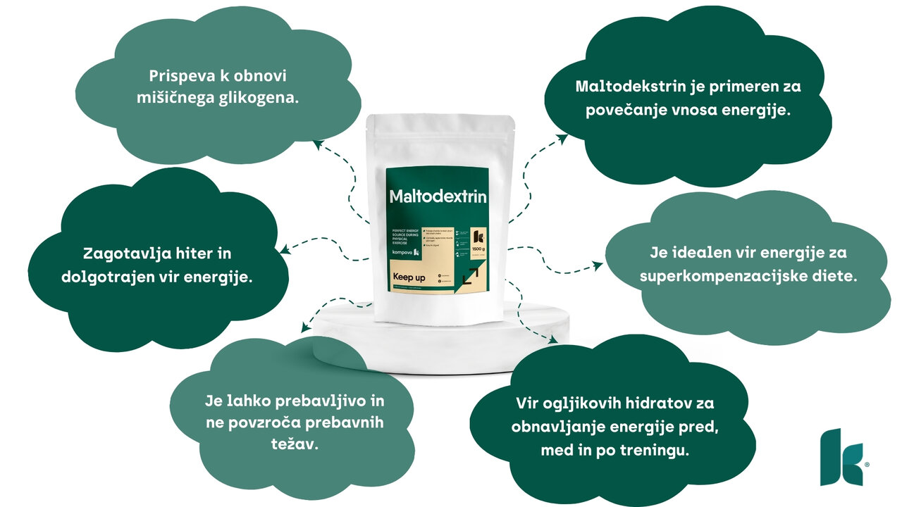 Maltodekstrin je primeren za povečanje vnosa energije. Ker je to kompleks sestavljenih sladkorjev, takoj po zaužitju zagotovi glukozo v krvni obtok in ustrezno dopolni potreben glikogen. V črevesju se nato maltodekstrin razgradi na posamezne molekule glukoze, ki se absorbirajo in stabilno zvišujejo raven sladkorja v krvi.