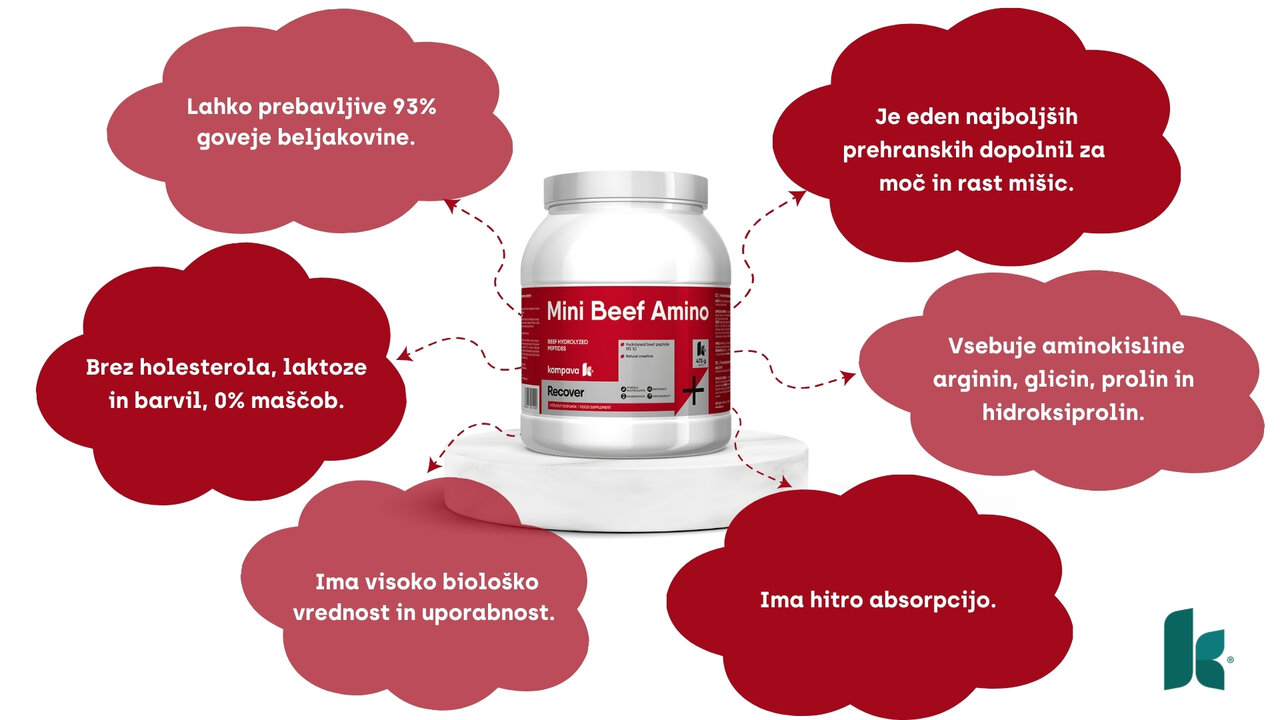 Goveji peptidi so odličen vir esencialnih in neesencialnih aminokislin. Beef Amino vsebuje v optimalnem razmerju aminokisline arginin, glicin, prolin in hidroksiprolin. Te aminokisline zagotavljajo tvorbo kolagena, ki je nujen za zdravje kit, vezi, vezivnih tkiv, srčne mišice in vseh notranjih organov. Hkrati vsebujejo naravni kreatin, železo, cink, fosfor, vitamine skupine B in vitamine E in A.