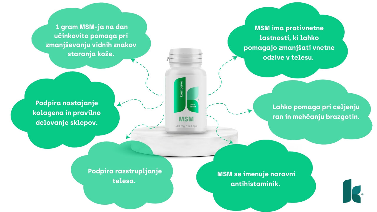 MSM lahko pomaga pri alergijah zaradi svojih protivnetnih lastnosti. Pri alergijskih reakcijah imunski sistem pogosto sproži vnetne procese, ki povzročajo simptome, kot so srbenje, rdečina ali oteklina. MSM lahko pomaga zmanjšati ta vnetni odziv tako, da deluje kot naravni antihistaminik in zmanjša reakcije na alergene. Poleg tega lahko MSM tudi okrepi celične stene in izboljša prepustnost celičnih membran, kar lahko pomaga ublažiti simptome alergij. - blagodejno vpliva na aknasto kožo