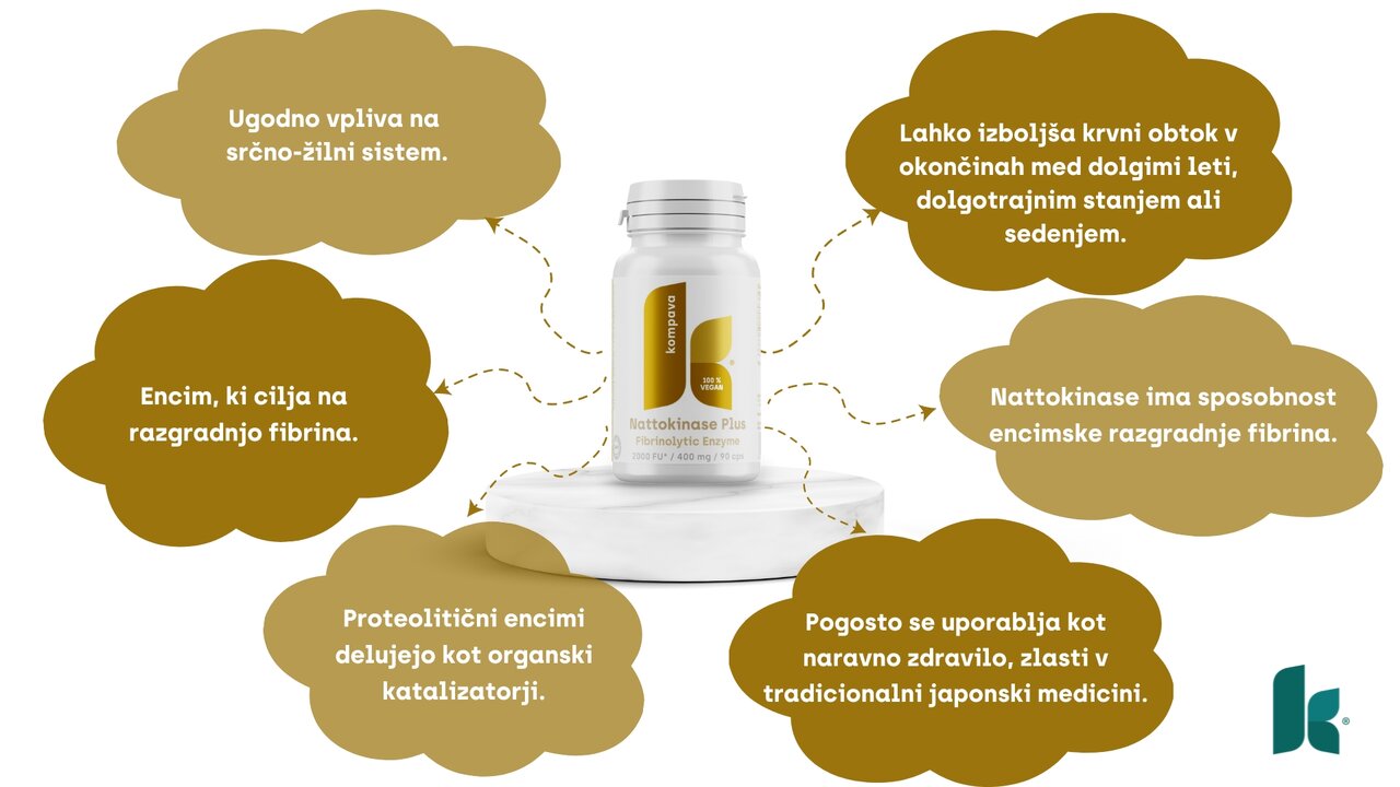 Nattokinase je encim, ki cilja na razgradnjo fibrina, beljakovine, ki ima ključno vlogo pri nastajanju krvnih strdkov. Fibrin je netopna beljakovina, ki nastane v zadnji fazi strjevanja krvi. Najdemo ga v krvnih žilah in krvnem obtoku. Krvne celice so ujete v mrežo iz fibrina. Velika pajčevina lahko privede do zamašitve žil in posledično do razvoja različnih bolezni srca in ožilja.Nattokinase ima sposobnost encimske razgradnje fibrina, kar lahko pomaga pri naravnem procesu razgradnje strdkov v telesu. Ta encim se pogosto uporablja kot naravno zdravilo, zlasti v tradicionalni japonski medicini, saj lahko izboljša ravnovesje v procesu strjevanja krvi.
