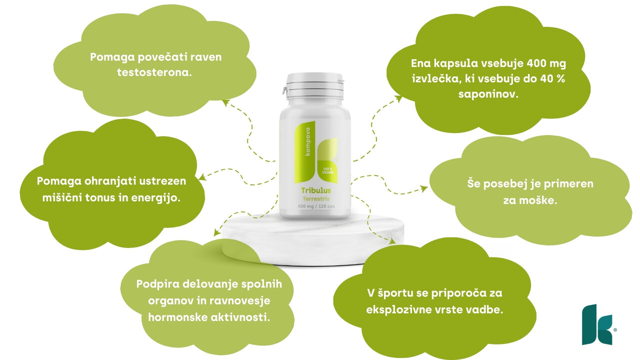Tribulus terrestris je nizko rastoča rastlina, katere plodovi in korenine so bogati z bioaktivnimi snovmi, kot so saponini, ki veljajo za glavne sestavine, ki prispevajo k blagodejnim učinkom na moški organizem. Rastlina Tribulus terrestris (znana tudi kot glista) ima izjemno sestavo in vsebuje spekter aktivnih snovi, kot so saponini, alkaloidi, bioflavonoidi, fitosteroli, tanini in smole.