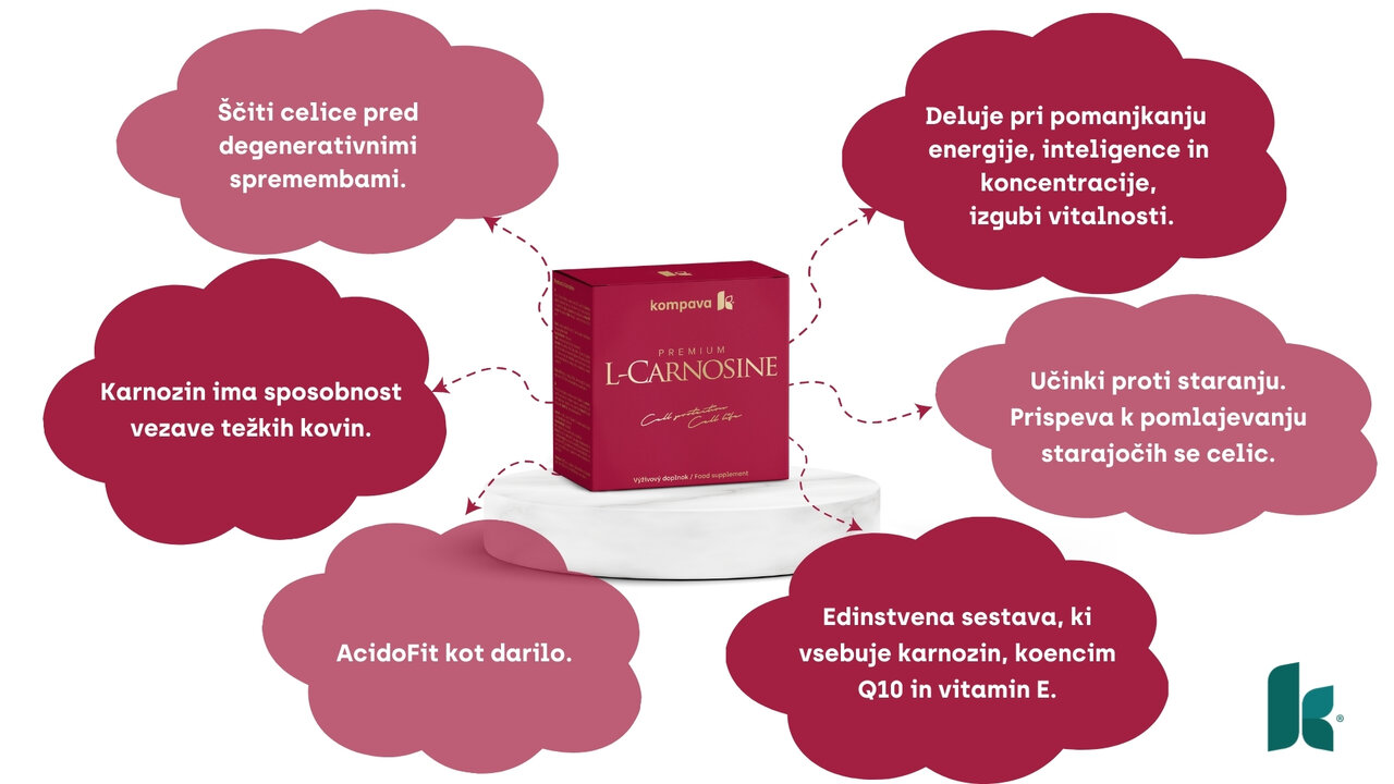 L-karnozin je aminokislina, katere raven v telesu s starostjo naravno upada. Pri 70-letniku se njegova količina lahko zmanjša tudi do 60 %, zato je dodajanje karnozina koristno. Pomanjkanje karnozina v telesu prispeva k hitrejšemu staranju, saj celice nimajo zadostne zaščite. Karnozin ima sposobnost vezave težkih kovin, kar prispeva k njihovemu odstranjevanju iz telesa. Povečana količina težkih kovin v telesu je danes pogosta težava, ki ima za posledico različne bolezni.