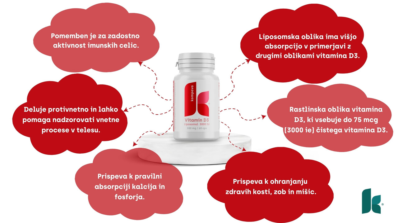Lipozomski vitamin D3 (3000 IU) je pomemben za zadostno aktivnost imunskih celic, s čimer prispeva k pravilnemu delovanju imunskega sistema. Pomemben je tudi za pravilno absorpcijo in uporabo kalcija in fosforja, s čimer prispeva k ohranjanju zdravih kosti, zob in mišic. Vitamin D je topen v maščobah, kar pomeni, da je njegova absorpcija v prebavnem traktu omejena. Prav zaradi tega je bolje jemati vitamin D, ki ima v organizmu boljšo izkoristljivost. Sem spada lipozomska oblika vitamina D3, ki se skoraj popolnoma absorbira v črevesju in od tam potuje na določeno mesto v organizmu.